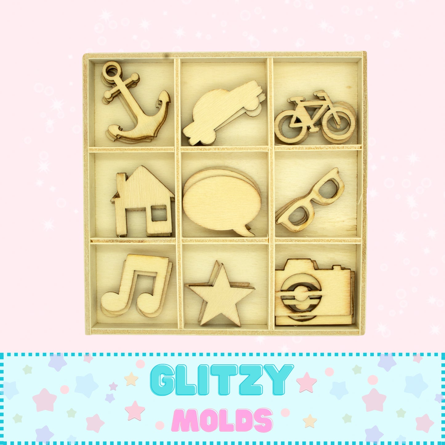 Mini caja de accesorios de mdf de 36 piezas. Perfecto para complementar tus apliques. La caja viene con 9 estilos diferentes, 4 piezas por estilo. Las piezas varían en tamaño, pero están aproximadamente dentro del rango de 1 pulgada.