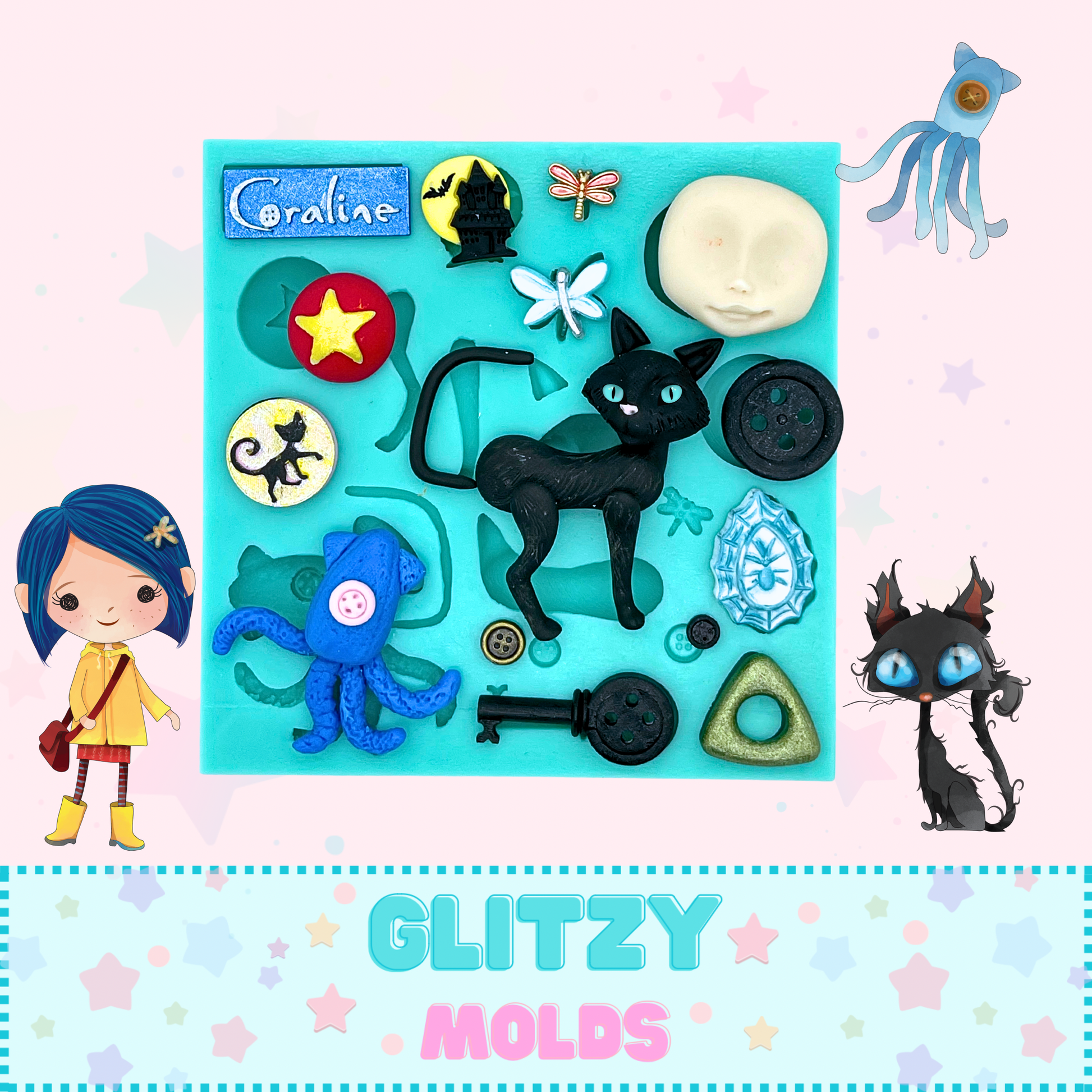 Adorable Coraline inspired silicone mold. Mold is a collaboration with the very talented Brenda Muñiz from Yuya's by Brenda Muñiz and Glitzy Molds. This is a perfect mold to create pieces for hair bows, pens and jewelry!