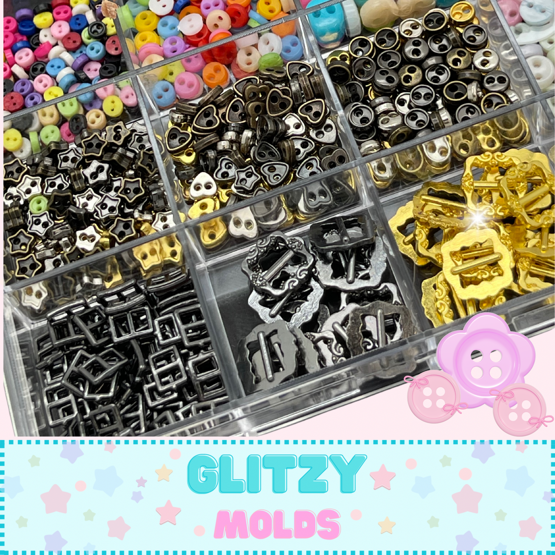 Mixed micro buttons box. Comes with 12 compartments with tons of different types of mini buttons to embellish your pieces. Your imagination is the limit!