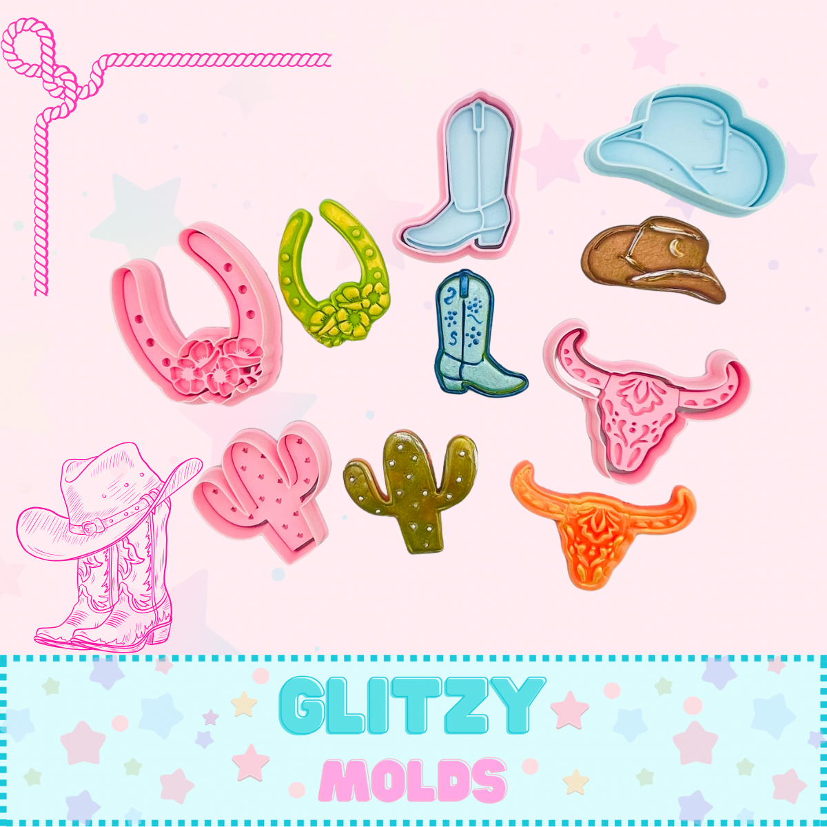 Beautiful set of Western themed cutters and matching stamps. These pieces were designed in house and 3D printed with much care, attention to detail and the best quality materials.